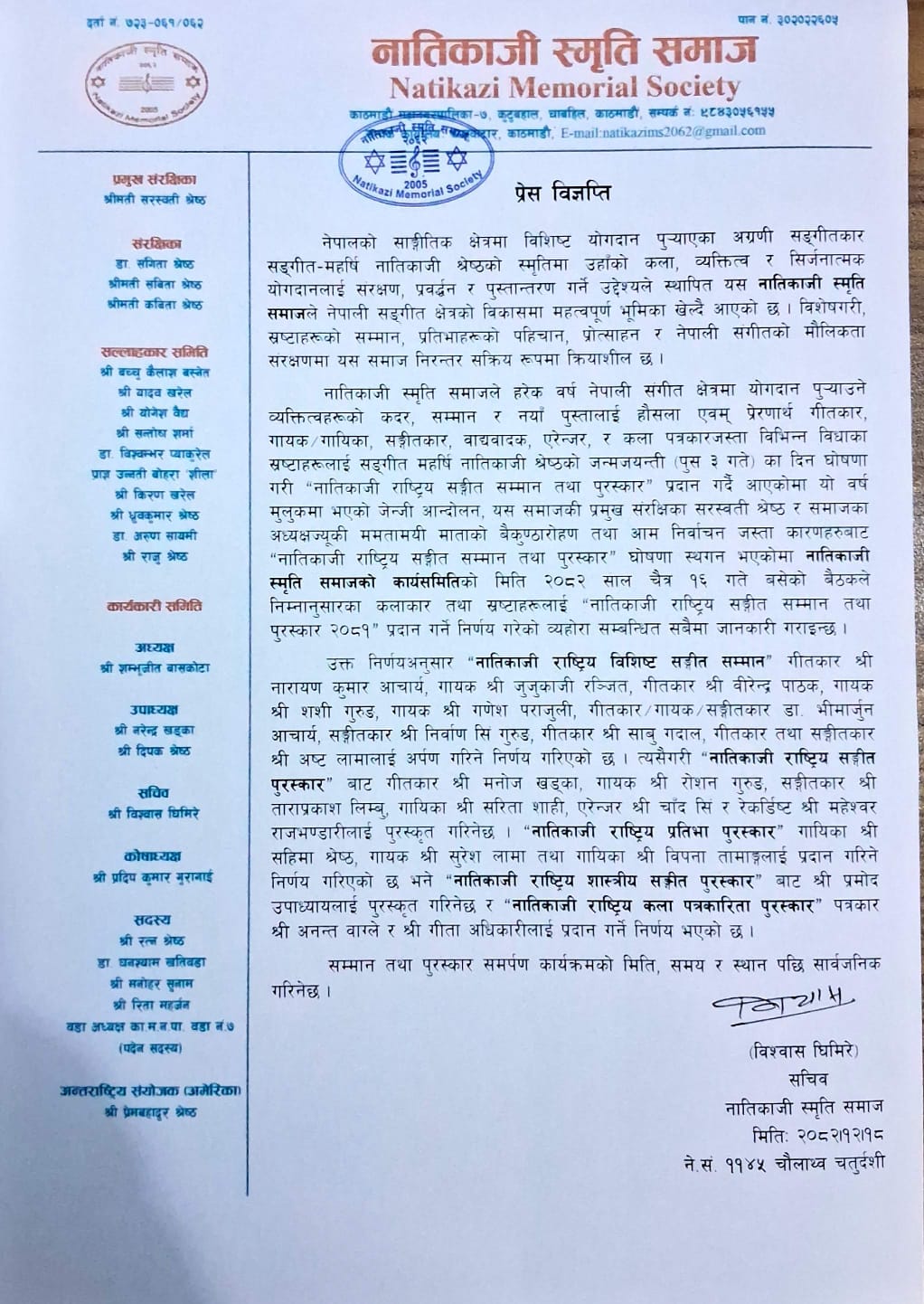 नातिकाजी स्मृति समाजले हरेक वर्ष नेपाली संगीत क्षेत्रमा योगदान पु¥याउने व्यक्तित्वहरूको कदर, सम्मान र नयाँ पुस्तालाई हौसला एवं प्रेरणार्थ गीतकार, गायक÷गायिका, संगीतकार, वाद्यवादक, एरेन्जर र कला पत्रकार जस्ता विभिन्न विधाका स्रष्टाहरूलाई संगीत महर्षि नातिकाजी श्रेष्ठको जन्मजयन्ती (पुस ३ गते) का दिन घोषणा गरी ‘नातिकाजी राष्ट्रिय संगीत सम्मान तथा पुरस्कार’ प्रदान गर्दै आएकोमा यस वर्ष मुलुकमा उत्पन्न जटिल परिस्थिति तथा समाजकी प्रमुख संरक्षिका सरस्वती श्रेष्ठ र समाजका अध्यक्ष शम्भुजीत बास्कोटाकी ममतामयी माताको वैकुण्ठारोहणका कारण पुरस्कार घोषणा ढिलो भएको जनाएको छ ।